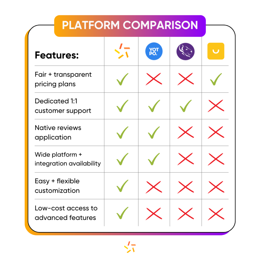 As mentioned previously, Yotpo also lacks transparency and flexibility in terms of pricing. To start, Yotpo is generally considered the most expensive option of all loyalty platform providers. Most plans require a demo before receiving a custom quote and all plans require an annual agreement, making it difficult for brands to commit or switch platforms if needed. Smaller brands may also struggle to get the support needed to run a successful loyalty program, as Yotpo’s dedicated one-to-one customer support is only available for Enterprise accounts. This can be especially challenging in the implementation stage, as some Yotpo features require extensive developer support for integration.