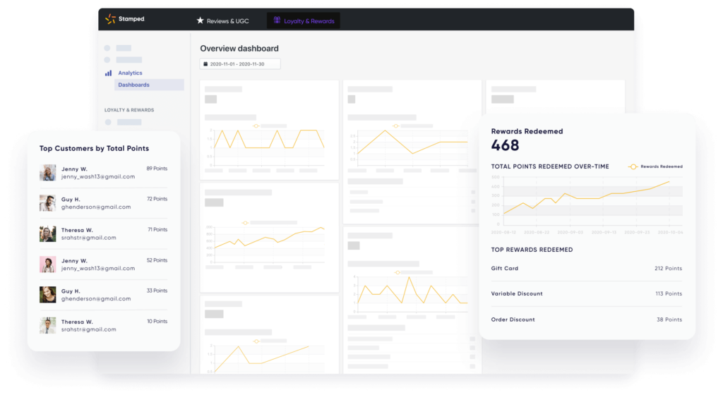 Brands also get access to powerful customer insights in the Loyalty analytics dashboard. They can identify top customers and advocates, total points and referrals, the most popular rewards, and more. These data points help brands learn more about their customers and inform their strategies for optimizing sales, engagement, retention, and lifetime value. Stamped customers on a full-suite plan can also view their rewards and reviews data in one place.