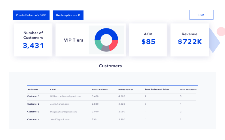 Smile’s admin dashboard gives brands access to customer data and analytics like program membership, points history, and referral analytics. They can look at redemption rates, points volume, referral traffic and purchases, and membership history to learn more about their customers’ activity and behaviors.