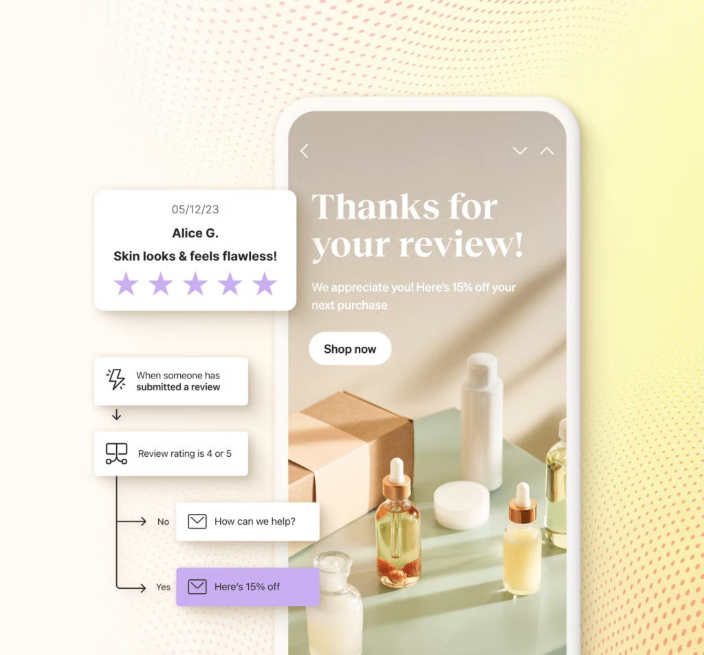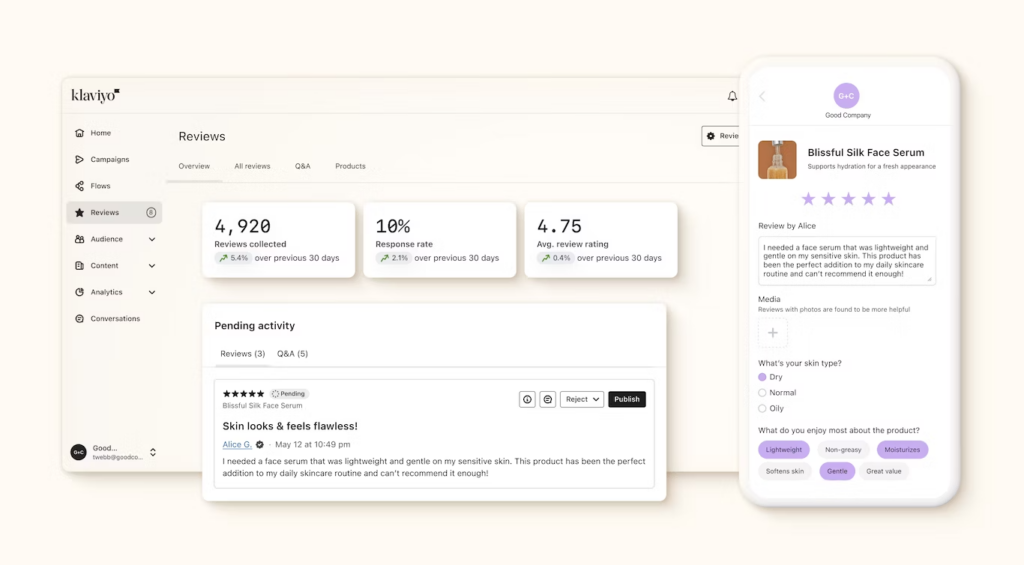 With Klaviyo’s Reviews, brands can collect reviews and customer data, display and manage their product reviews, and give shoppers the confidence they need to make a purchase. They can send automated review requests, gather insights from custom questions, design on-brand experiences, segment users based on review data, and build trust with verified reviews.