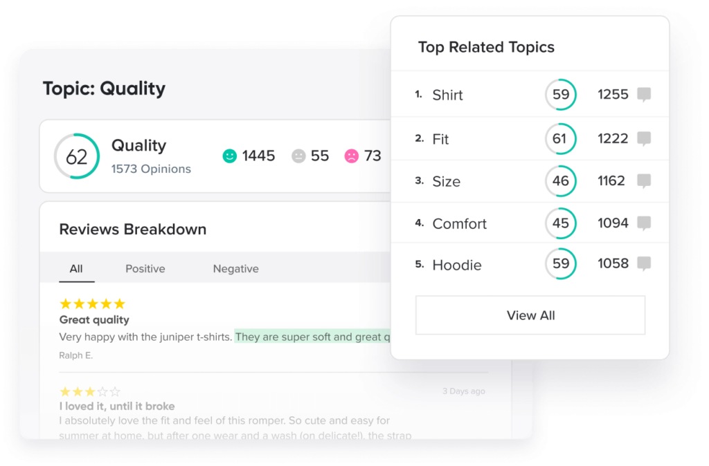 Note: Reporting templates and advanced consumer insights are limited to Prime customers and up. AI-powered features like review tagging and smart filters, which help brands sort reviews and identify common review topics, are available for Premium and Enterprise accounts only.