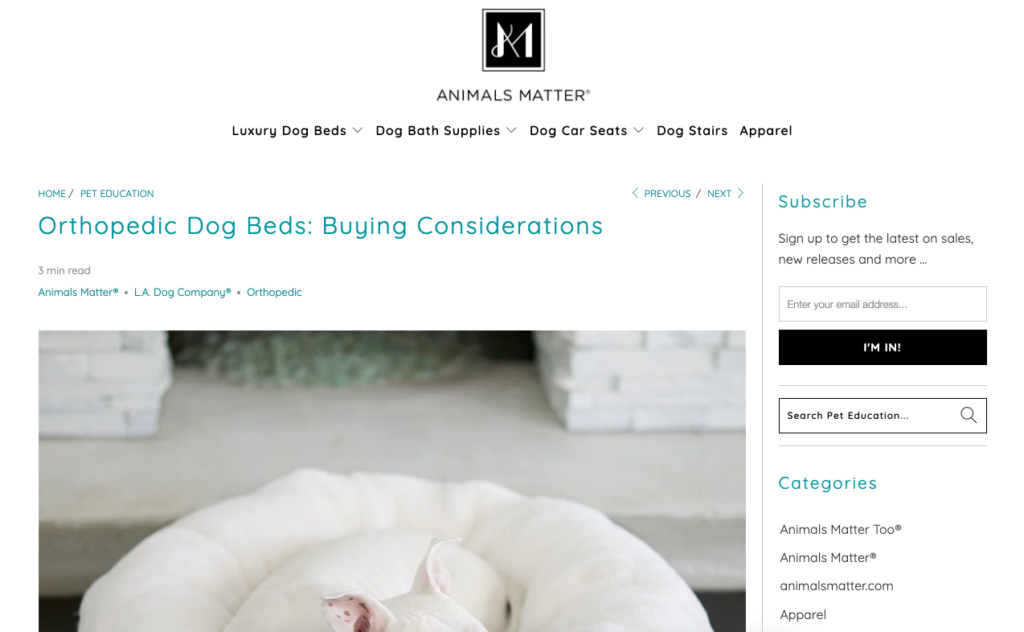 Customers in the conversion stage also seek out articles and endorsements before making a decision, especially if it’s a one-time purchase and/or an expensive item. Expert testimonials and blogs help customers determine whether something is right for them. For example, Stamped customer Animals Matter publishes educational articles about how to choose the right dog bed, what customers can do to ease their dog’s anxiety, and so on. This helps contextualize products and increase credibility, making customers feel more comfortable about making a purchase.