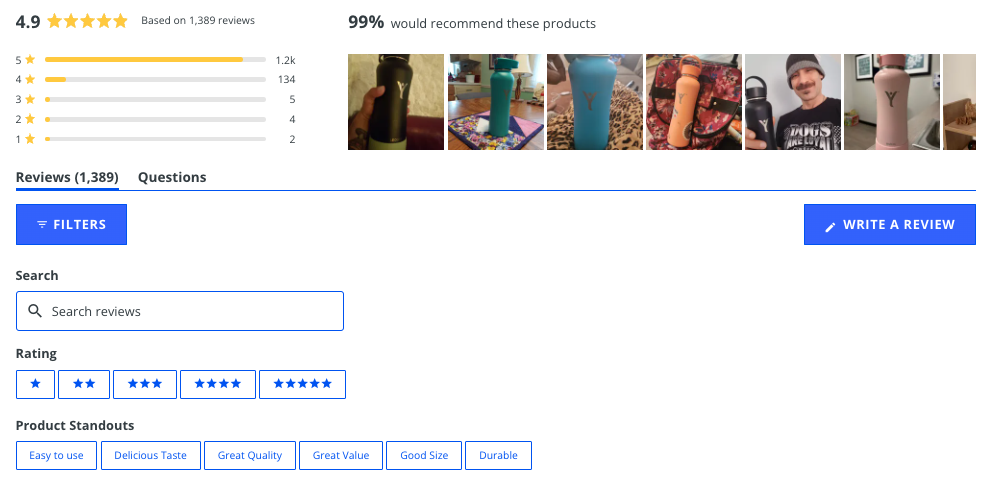 For example, Stamped customer DYLN has collected thousands of reviews for their insulated water bottles. Potential customers can filter reviews by rating, product features like size and durability, and specific keywords. They can also ask questions to determine whether the product is right for them. DYLN can not only use this information to build credibility and trust, but it can also use it to continuously improve its products and content, such as adding requested features or including common questions in the FAQ.