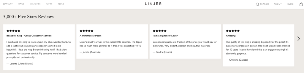 The best way to boost customer confidence is by featuring site and product reviews. People are often skeptical when making purchases online since they can’t see or try the product, so they usually turn to reviews to get more information. Brands like Stamped customer Linjer showcase reviews on their homepage and product pages to make it easier for potential customers to learn, compare, and convert.