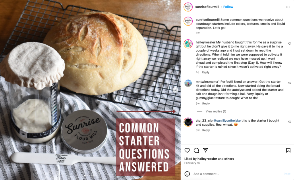 Another way to generate engagement from potential customers is to start a conversation. Brands do this by creating polls, asking questions, and discussing product-related topics. For example, Stamped customer Sunrise Flour Mill answers commonly asked questions about their products, such as what to look for in sourdough starters. These conversations make brands feel more relatable and credible, building trust. They also help brands learn more about their customers and identify which topics or types of content drive the most engagement.