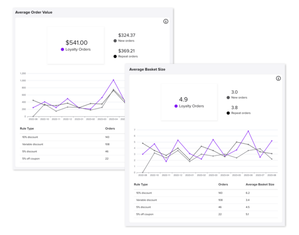 Average order value (AOV) is your total revenue divided by your total number of orders, while average basket size is the number of products purchased by a customer in a single transaction. These graphs track the average order value and average basket size of new orders, repeat orders, and orders with a loyalty redemption. You will also be able to identify which program rules drive the highest average order value and largest basket size.