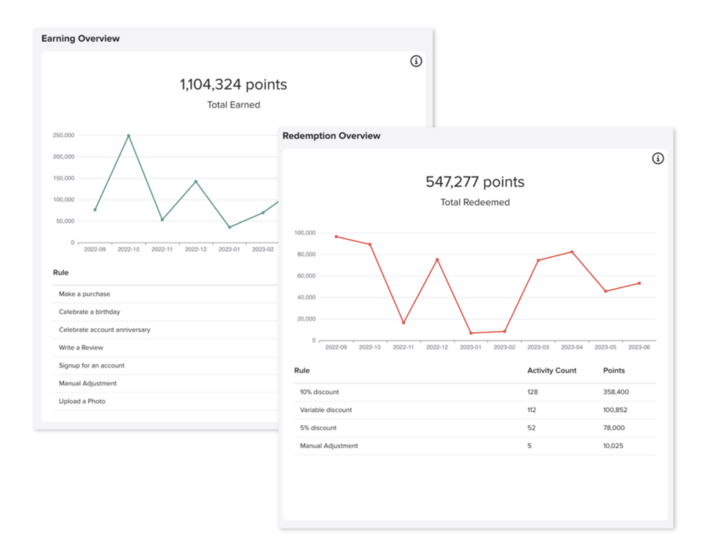 Earning Overview shows the total number of points earned by customers and highlights which program activities result in the most points earned. Redemption Overview shows the total number of points redeemed by customers and highlights which program rewards result in the most points redeemed.