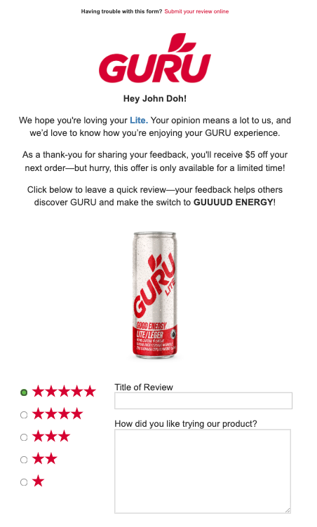 - Incentivize reviews with a $5 off coupon, driving both engagement and repeat purchases