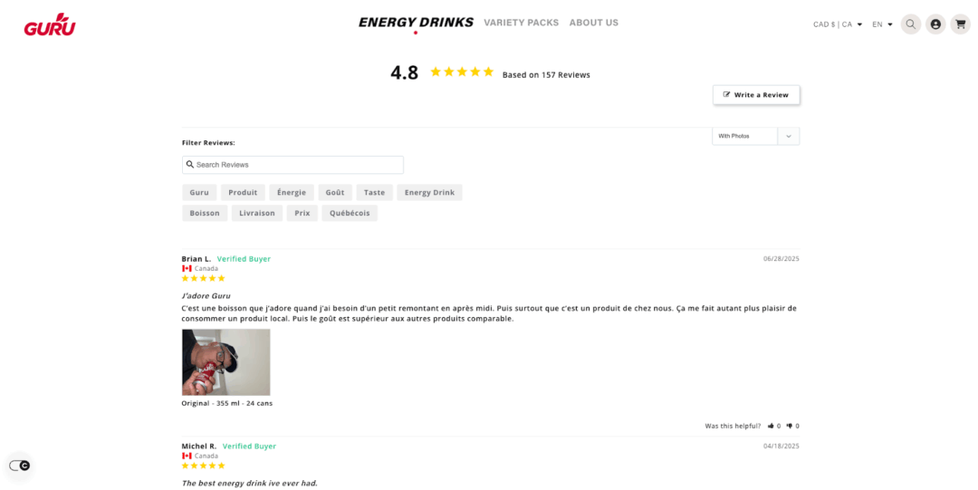 With distribution across North America and a growing DTC channel, the brand’s success is built on authenticity and transparency. GURU’s audience values function and purpose, expecting brands to deliver both performance and integrity. As their digital presence grew, so did the need for a scalable review system that aligned with their minimalist team and performance-driven ethos.