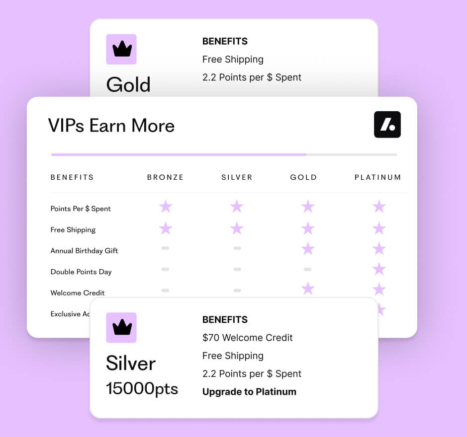 Seamless points tracking and redemption integrated into the customer journey. Deliver a fully customized, on-brand loyalty experience that matches your branding and theme. Offer customizable rewards, from discounts to exclusive perks, and create tiered rewards systems to incentivize more purchases.